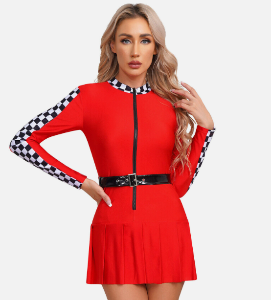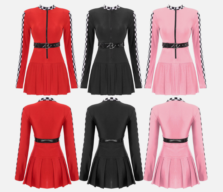 Checkerboard and belt make you a professional racing driver look, while pleated skirt adds a touch of cuteness, stylish and impressive.