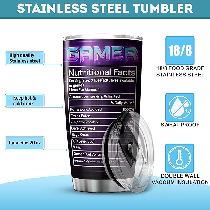 ZOXIX Gamer Coffee Tumbler Nutritional Facts Stainless Steel Mug With Lid 20oz Insulated Cup Vacuum Novelty Game Lovers Gifts Skull Mugs For Gamers Gaming Tumblers For Boys Visit the ZOXIX Store
