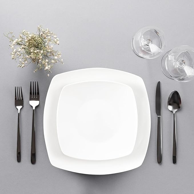 • HIGH-QUALITY PORCELAIN: This sophisticated, premium-quality white dish set has the right balance of weight and size, making family mealtimes extraordinary for years to come. Our square dinnerware set is microwave and oven safe, making cooking simple and quick. Note: Handle with care, as the plates and bowls can get hot when placed in the microwave.
